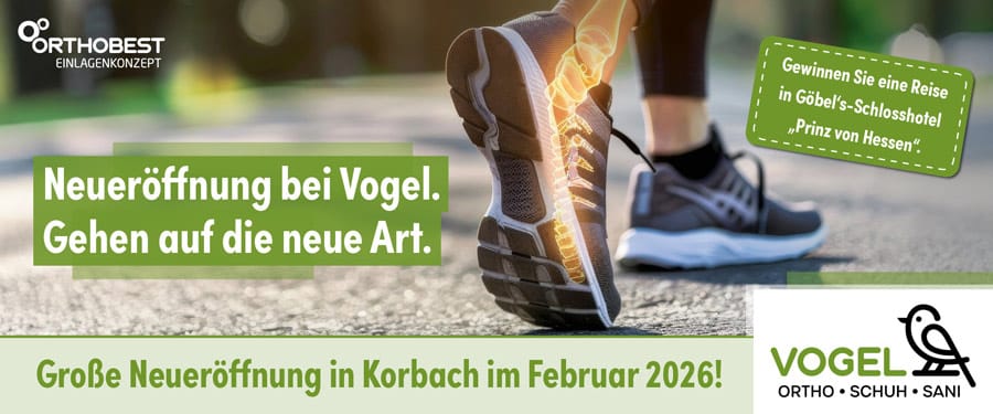 Wir erweitern unser Angebot und präsentieren unseren Standort in Korbach nach einem umfassenden Umbau im Februar 2026 in neuer Atmosphäre. Mit dem modernen Orthobest Einlagenkonzept, frischen Räumen und gewohnter Kompetenz rund um Ortho, Schuh und Sani setzen wir neue Maßstäbe für gesundes Gehen.